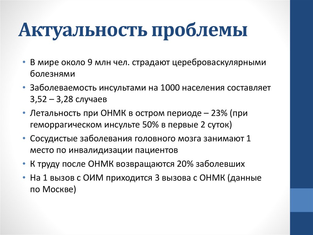 Актуальность проблемы• В мире около 9 млн чел. страдают цереброваскулярными