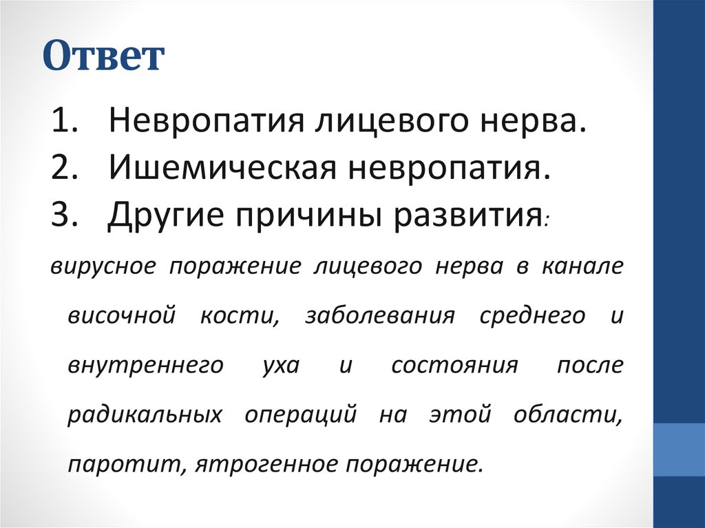 Ответ1. Невропатия лицевого нерва.