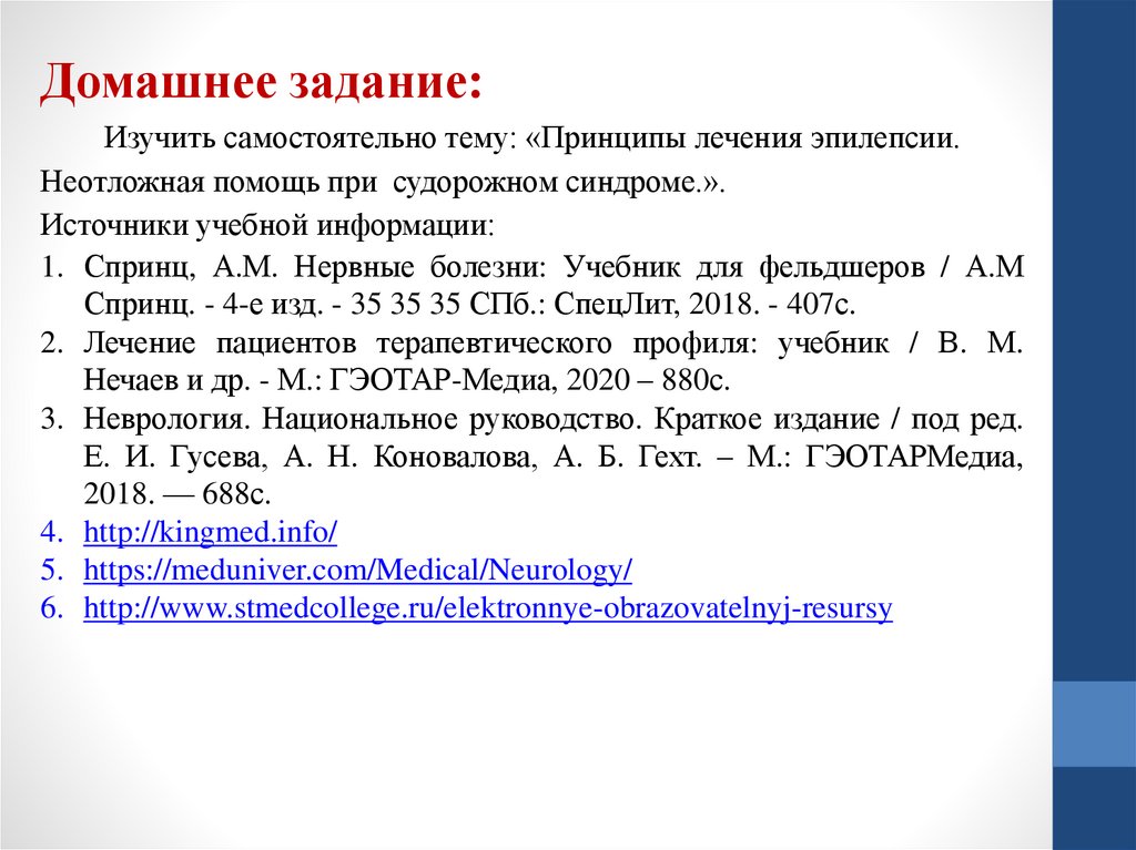 Домашнее задание:Изучить самостоятельно тему: «Принципы лечения эпилепсии.