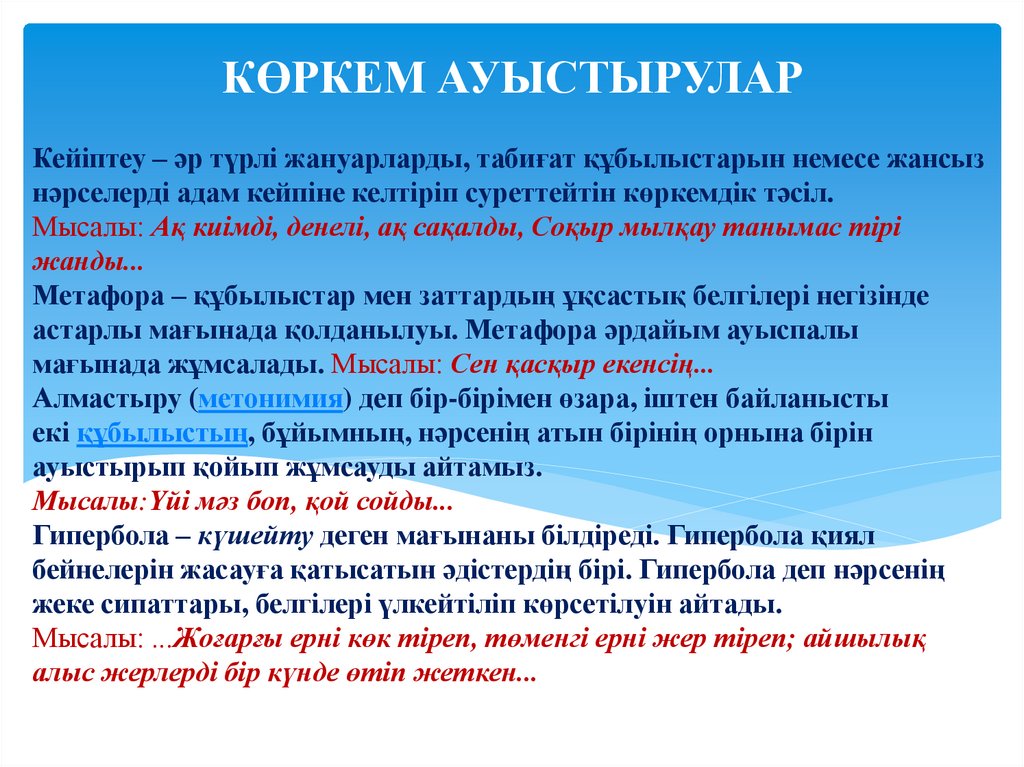 КӨРКЕМ АУЫСТЫРУЛАРКейіптеу – әр түрлі жануарларды, табиғат құбылыстарын немесе жансыз