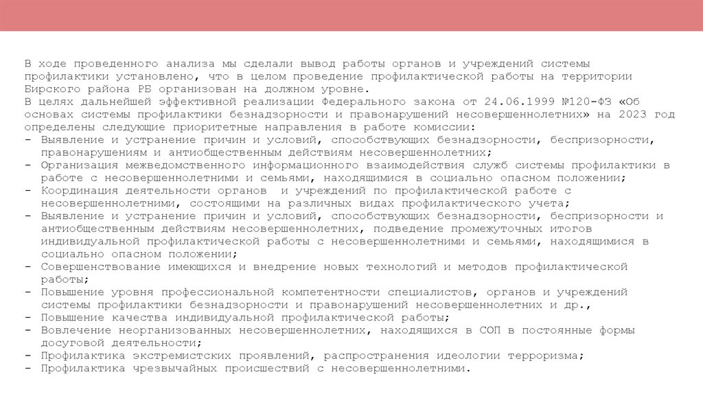 В ходе проведенного анализа мы сделали вывод работы органов и учреждений системыпрофилактики установлено, что в целом проведение профилактической работы на территории