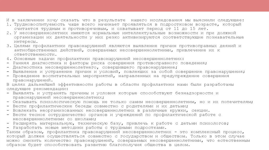 И в заключении хочу сказать что в результате нашего исследования мы выяснили следующее:1. Трудновоспитуемость чаще всего начинает проявляться в подростковом возрасте, который