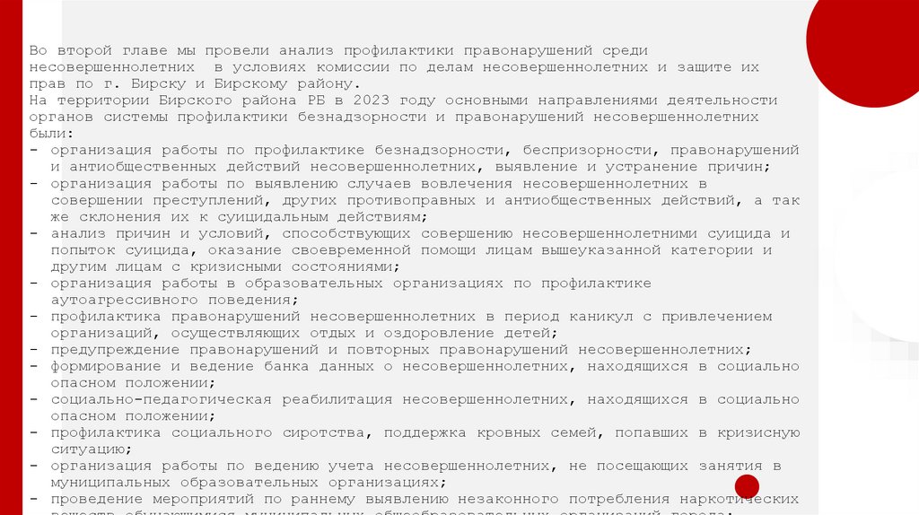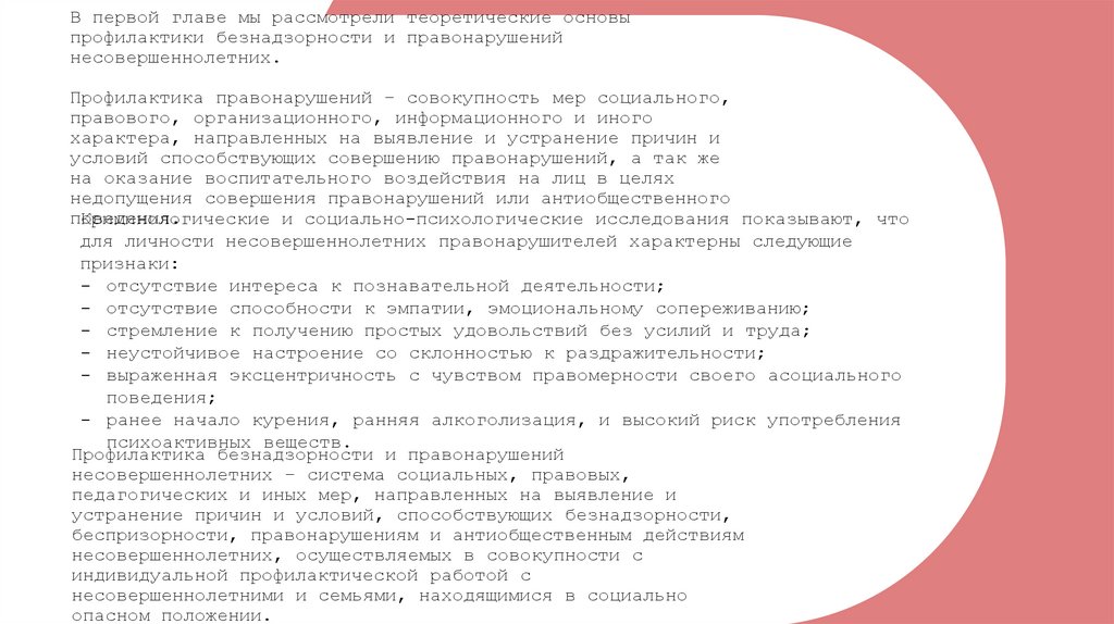 В первой главе мы рассмотрели теоретические основыпрофилактики безнадзорности и правонарушений