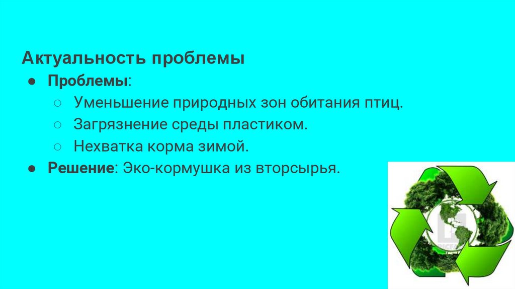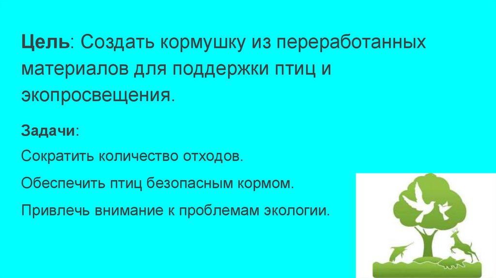 Цель: Создать кормушку из переработанныхматериалов для поддержки птиц и