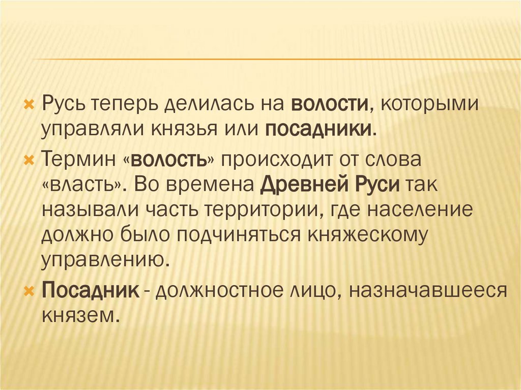 Русь теперь делилась на волости, которымиуправляли князья или посадники.