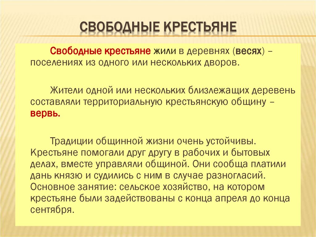 СВОБОДНЫЕ КРЕСТЬЯНЕСвободные крестьяне жили в деревнях (весях) –