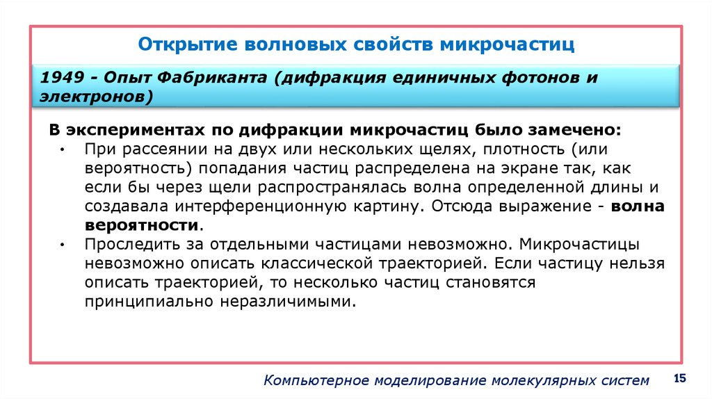 специфические свойства микрочастиц (электроны, атомы, молекулы).