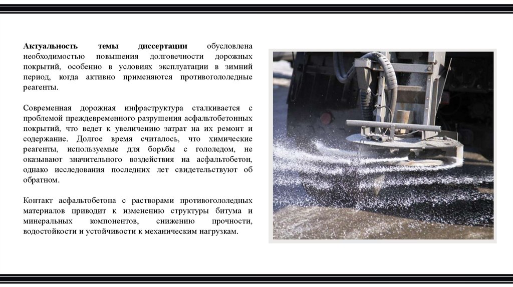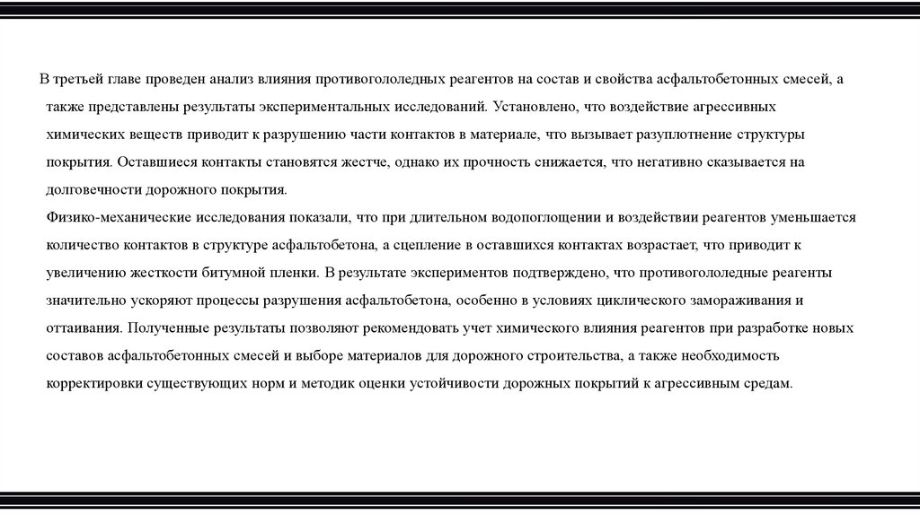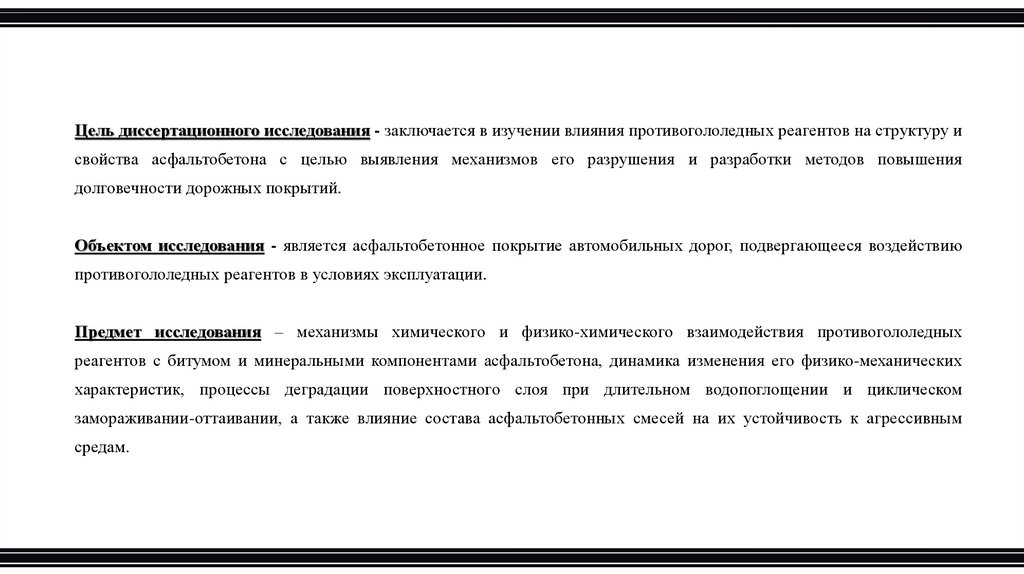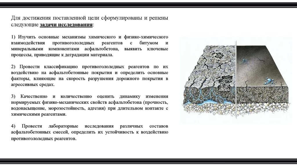 Цель диссертационного исследования - заключается в изучении влияния противогололедных реагентов на структуру исвойства асфальтобетона с целью выявления механизмов его разрушения и разработки методов повышения