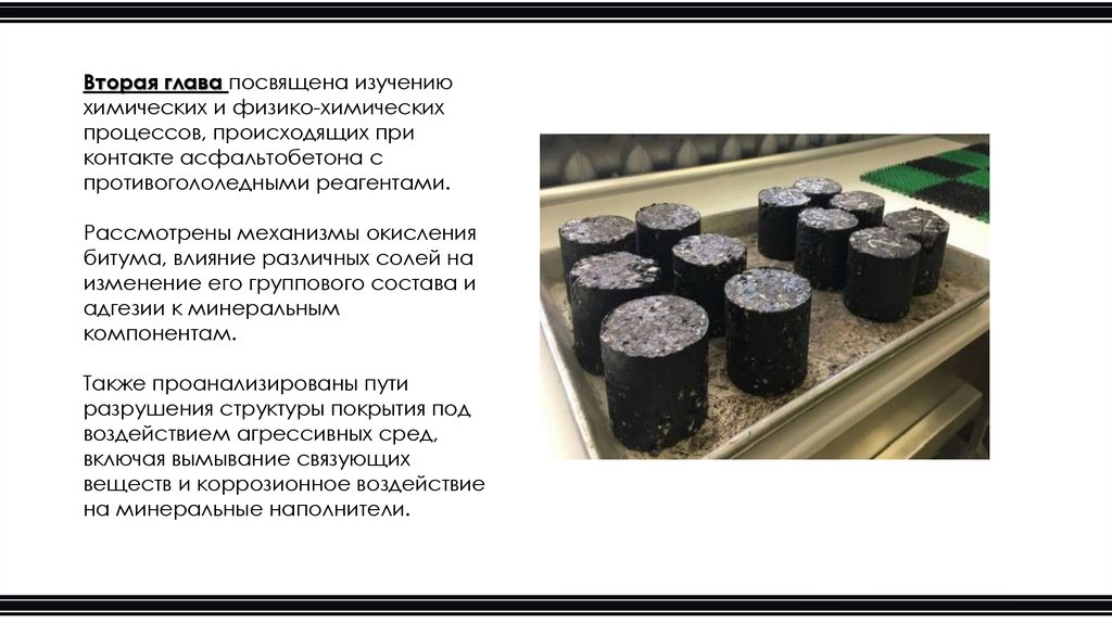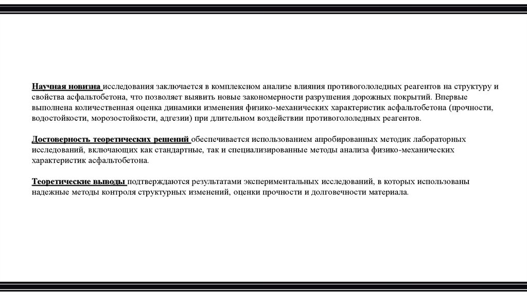 Научная новизна исследования заключается в комплексном анализе влияния противогололедных реагентов на структуру исвойства асфальтобетона, что позволяет выявить новые закономерности разрушения дорожных покрытий. Впервые