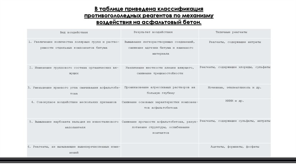 2) Провести классификацию противогололедных реагентов по их