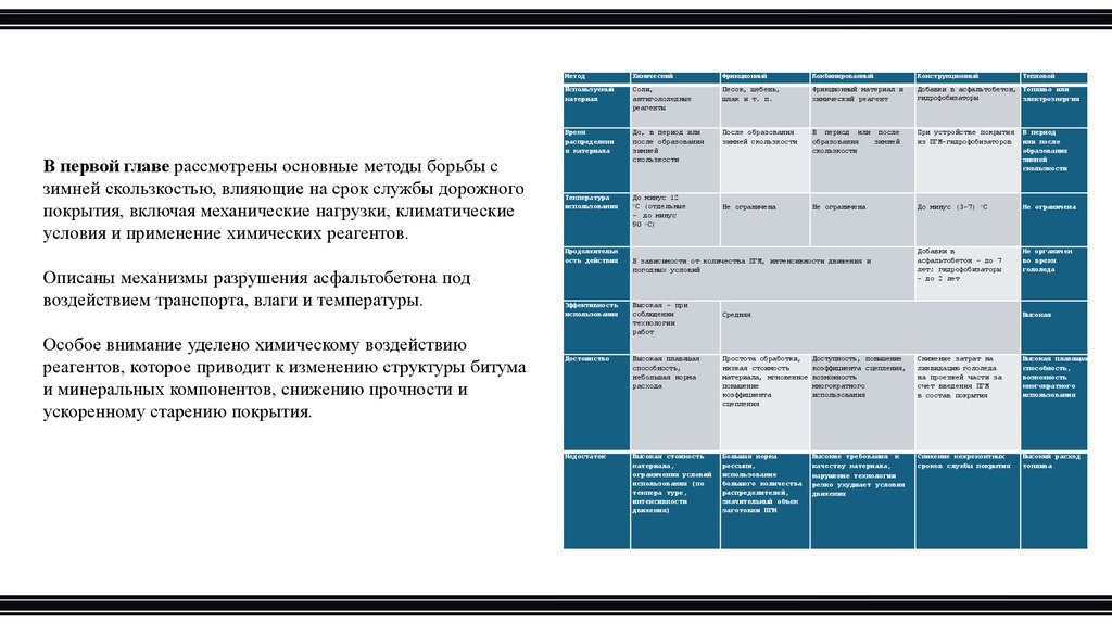 В первой главе рассмотрены основные методы борьбы сзимней скользкостью, влияющие на срок службы дорожного