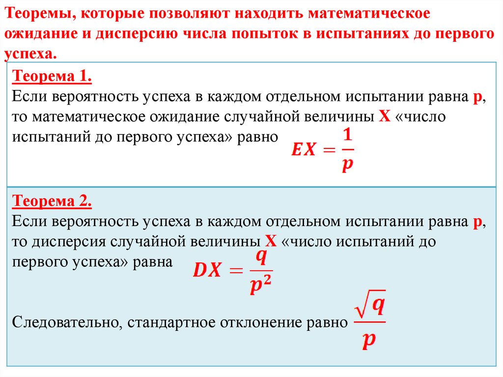 Теоремы, которые позволяют находить математическоеожидание и дисперсию числа попыток в испытаниях до первого