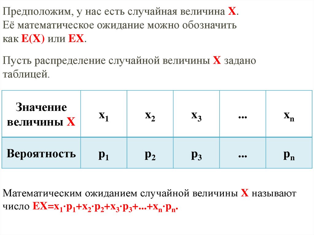 Предположим, у нас есть случайная величина X.Её математическое ожидание можно обозначить