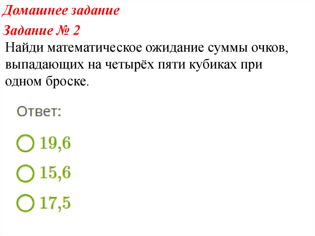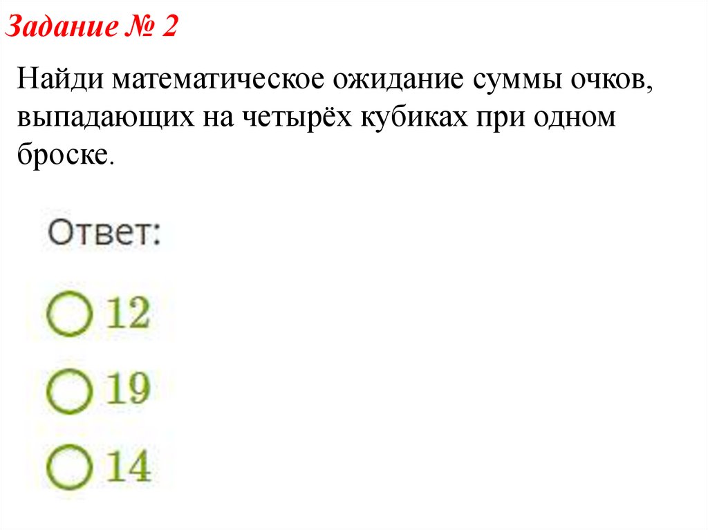 Задание № 2Найди математическое ожидание суммы очков,