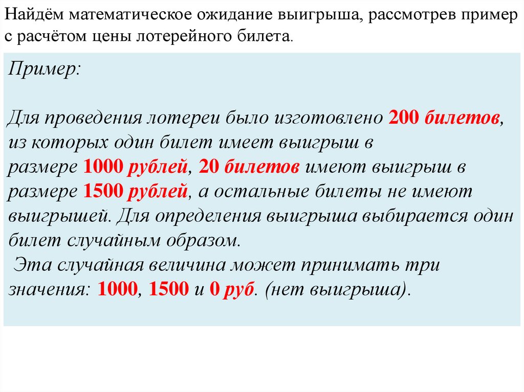Найдём математическое ожидание выигрыша, рассмотрев примерс расчётом цены лотерейного билета.