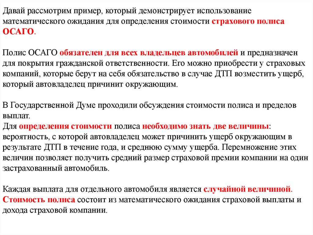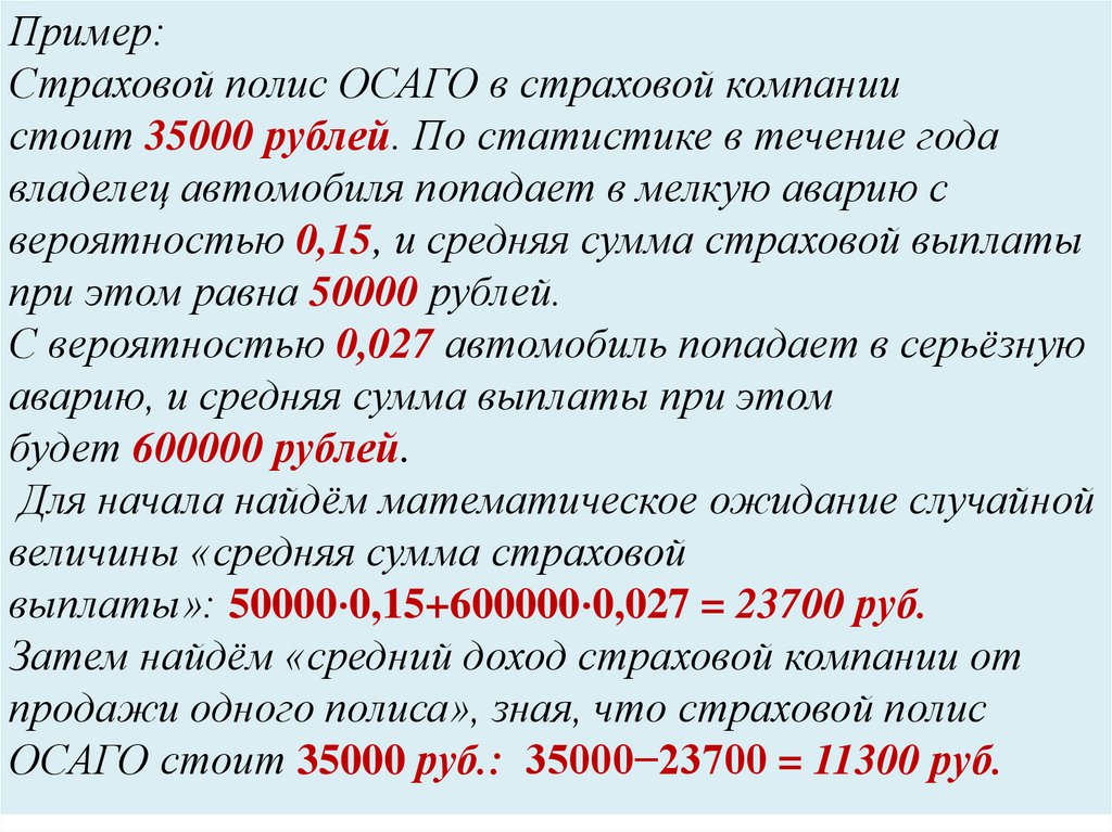 Давай рассмотрим пример, который демонстрирует использованиематематического ожидания для определения стоимости страхового полиса