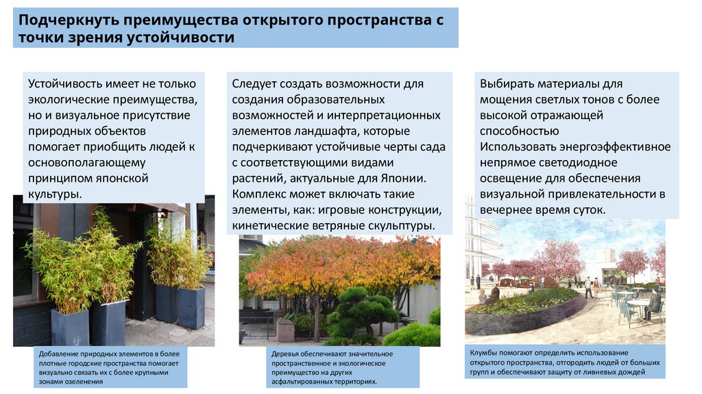 Подчеркнуть преимущества открытого пространства сточки зрения устойчивости