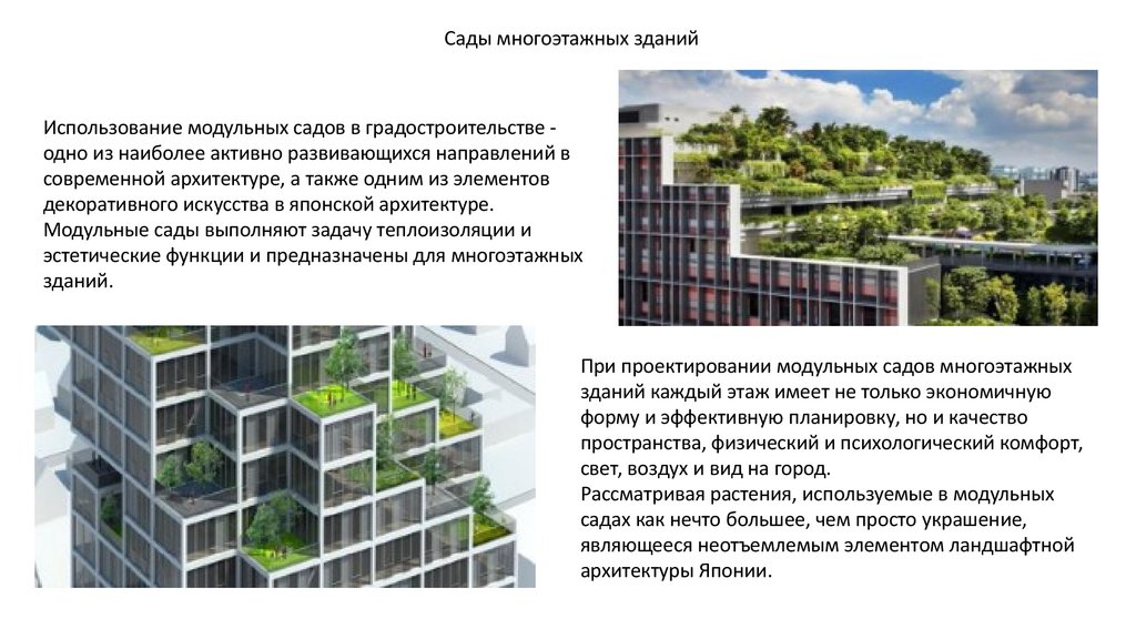 Сады многоэтажных зданийИспользование модульных садов в градостроительстве одно из наиболее активно развивающихся направлений в