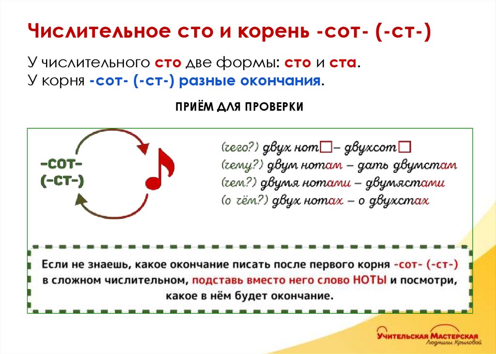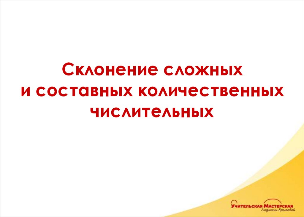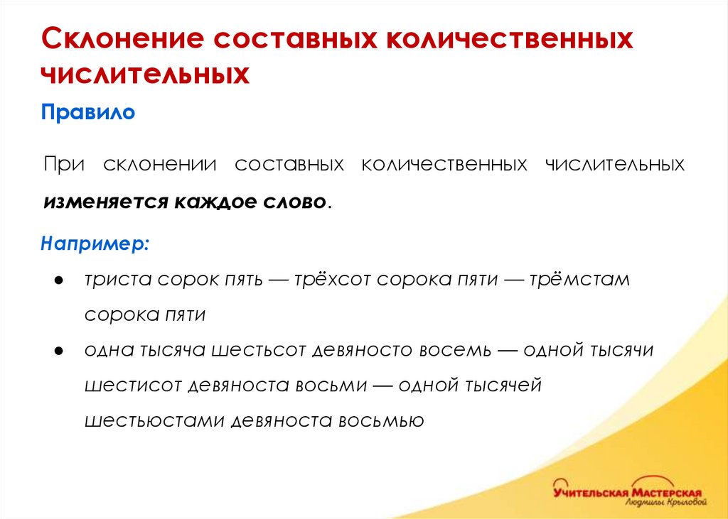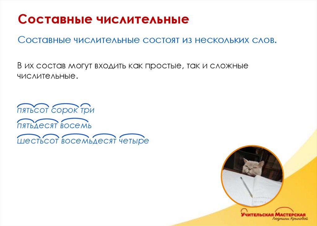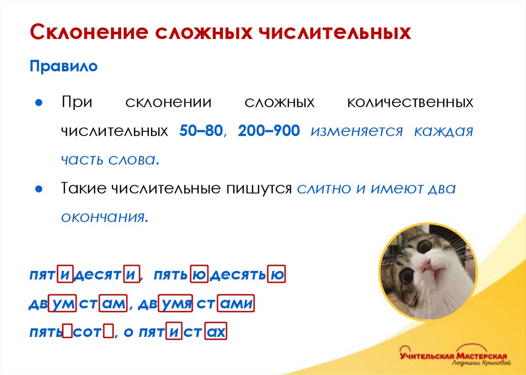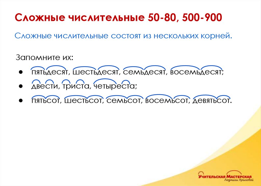 Сложные числительные 50-80, 500-900Сложные числительные состоят из нескольких корней.