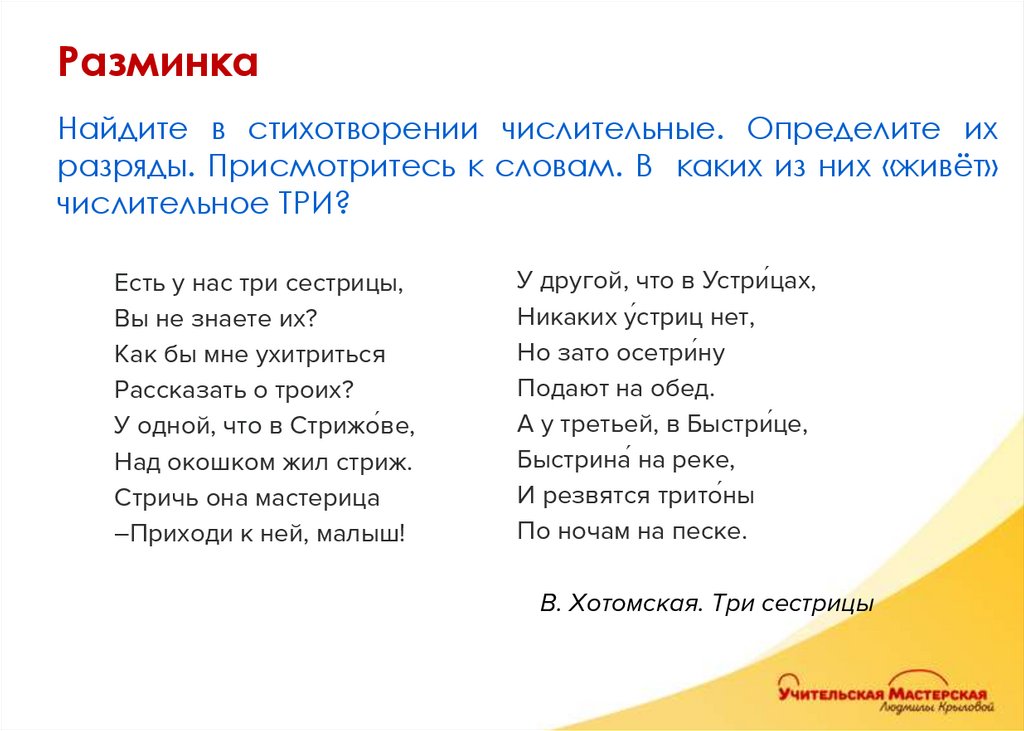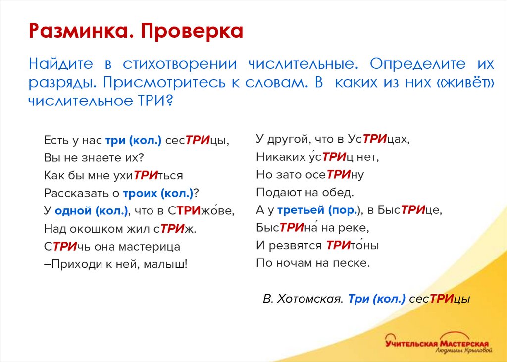 Разминка. ПроверкаНайдите в стихотворении числительные. Определите их