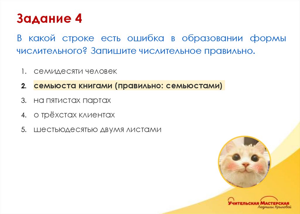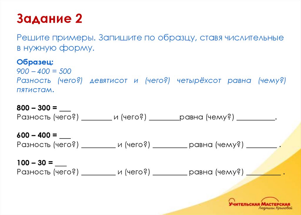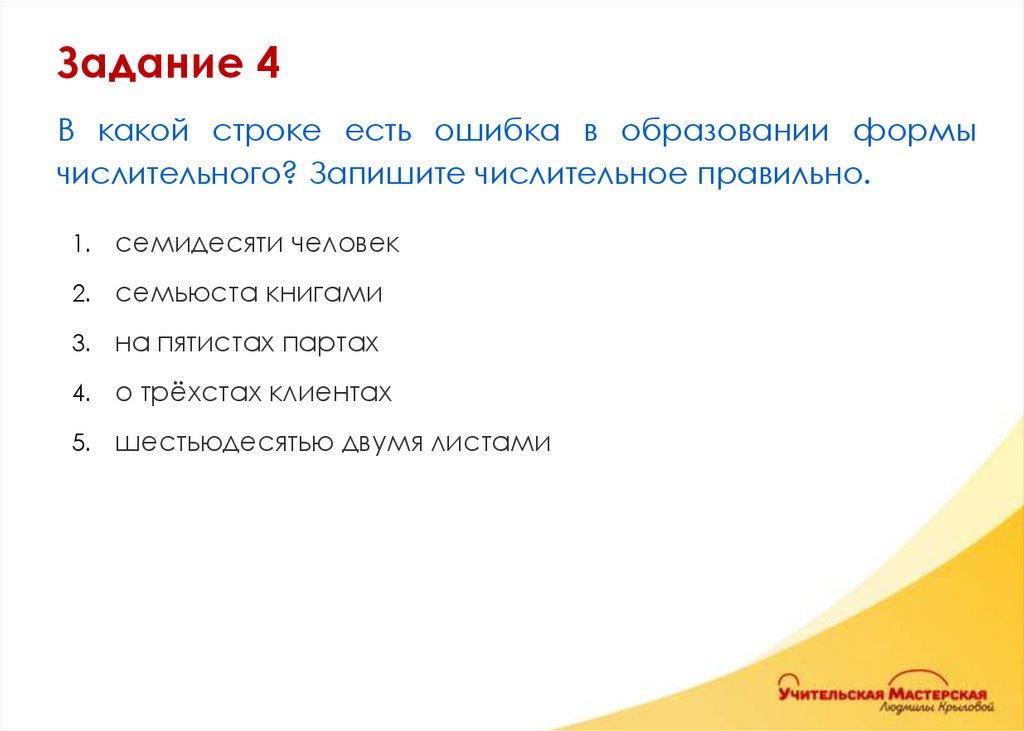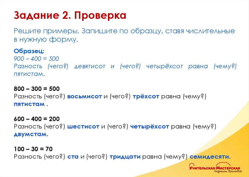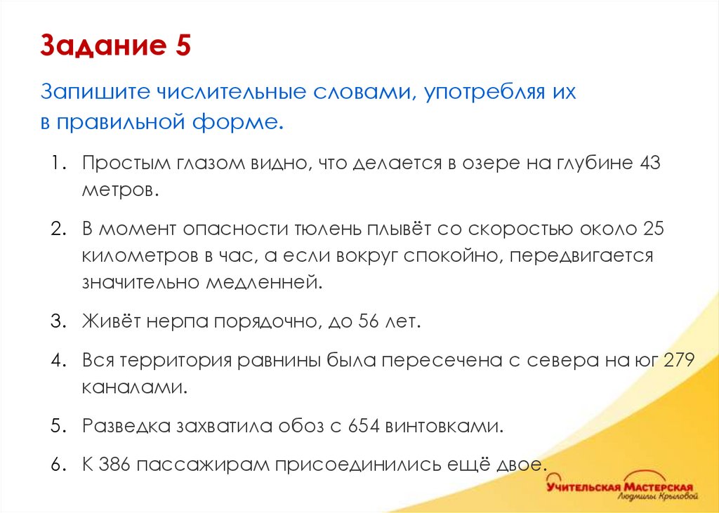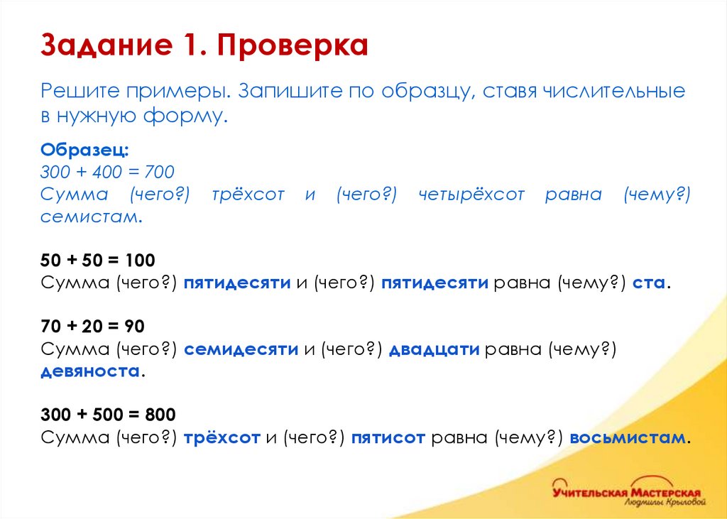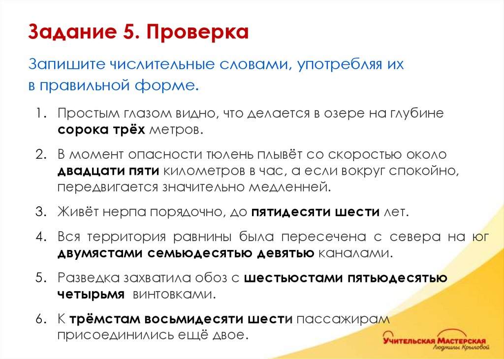 Задание 5. ПроверкаЗапишите числительные словами, употребляя их