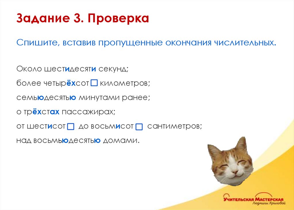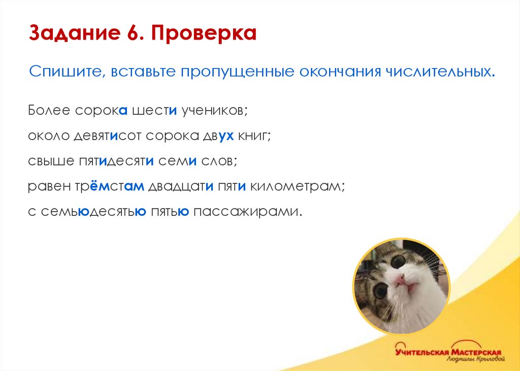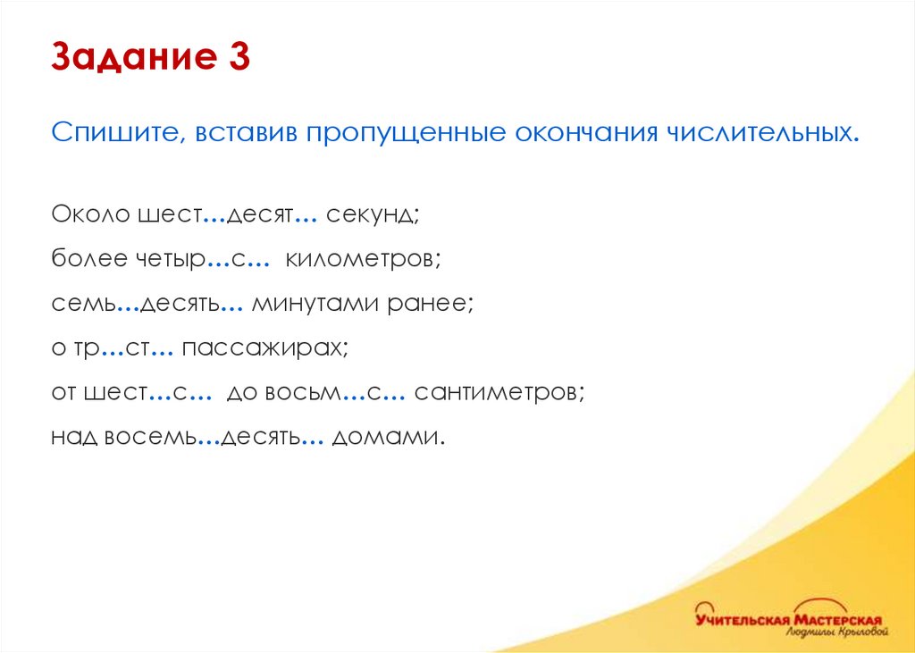 Задание 6. ПроверкаСпишите, вставьте пропущенные окончания числительных.
