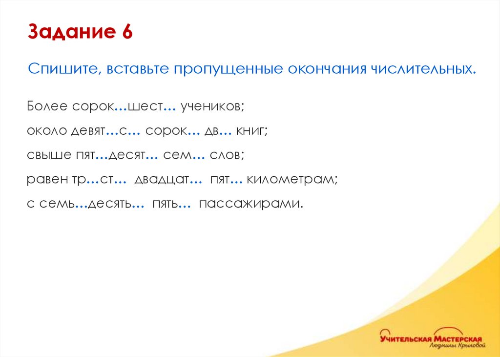 Задание 6Спишите, вставьте пропущенные окончания числительных.