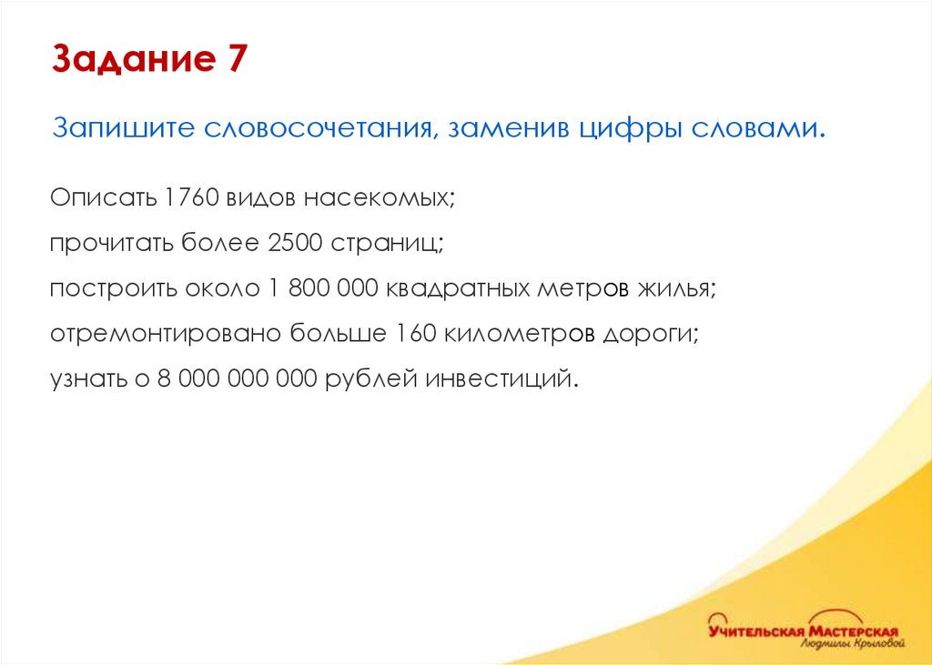 Задание 7Запишите словосочетания, заменив цифры словами.