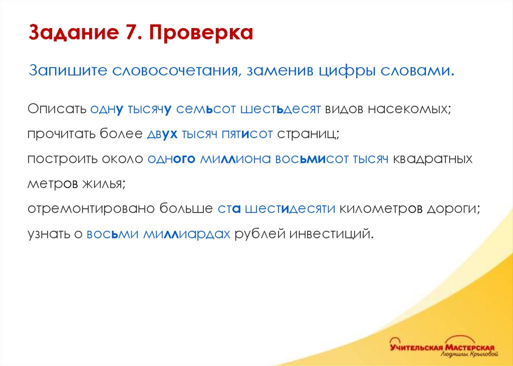 Задание 7. ПроверкаЗапишите словосочетания, заменив цифры словами.