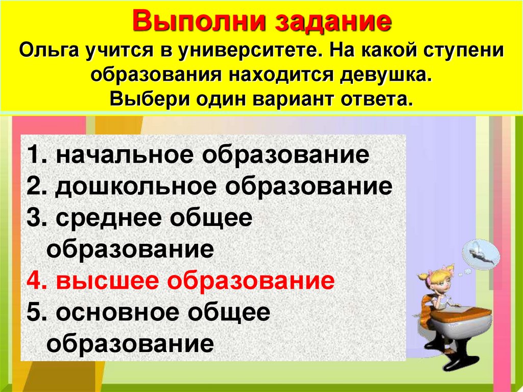10. Выполни задание Ольга учится в университете. На какой ступени образования находится девушка. Выбери один вариант ответа.