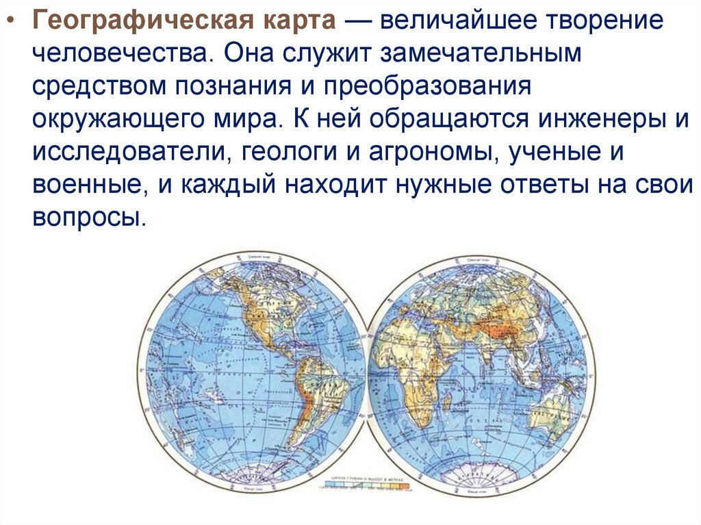 • Географическая карта — величайшее творениечеловечества. Она служит замечательным