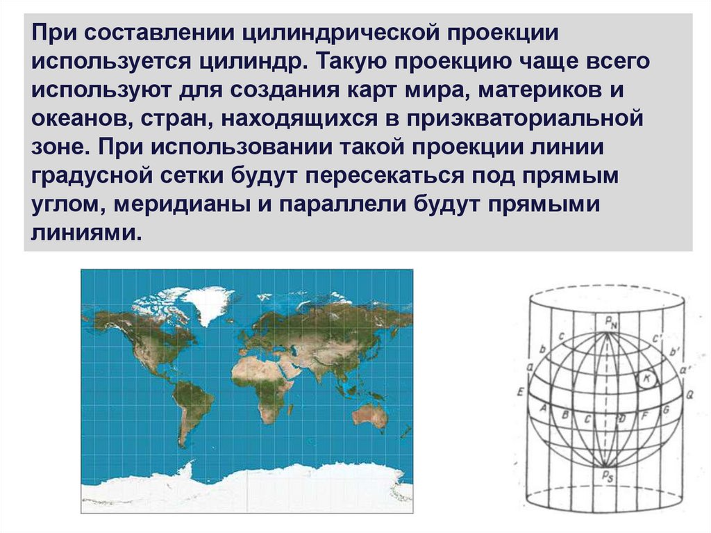 При составлении цилиндрической проекциииспользуется цилиндр. Такую проекцию чаще всего