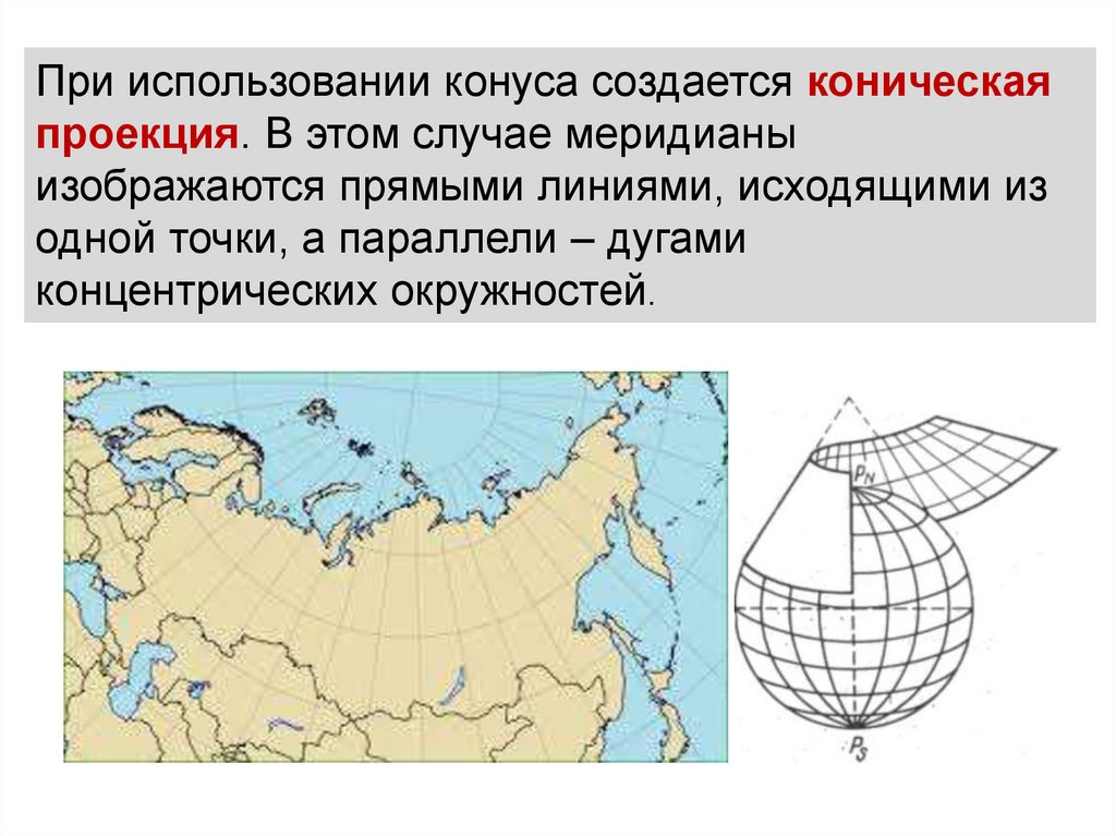 При использовании конуса создается коническаяпроекция. В этом случае меридианы