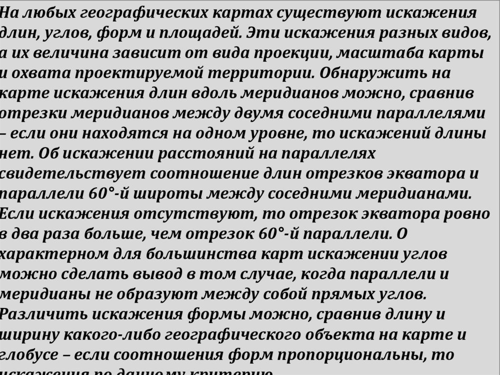 На любых географических картах существуют искажениядлин, углов, форм и площадей. Эти искажения разных видов,