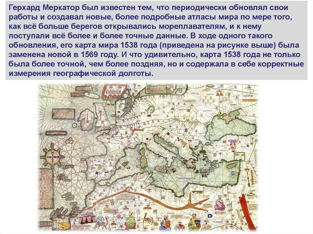 Герхард Меркатор был известен тем, что периодически обновлял своиработы и создавал новые, более подробные атласы мира по мере того,