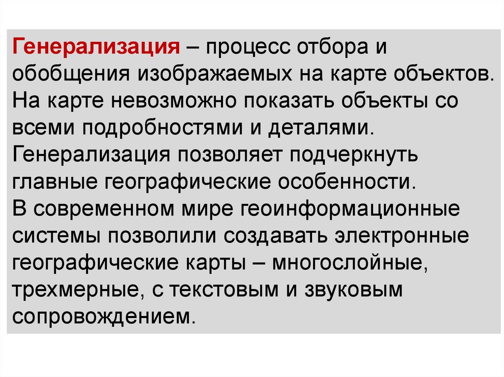 Генерализация – процесс отбора иобобщения изображаемых на карте объектов.