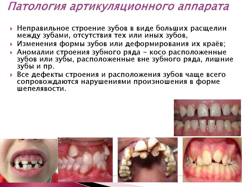 Неправильное строение зубов в виде больших расщелинмежду зубами, отсутствия тех или иных зубов,