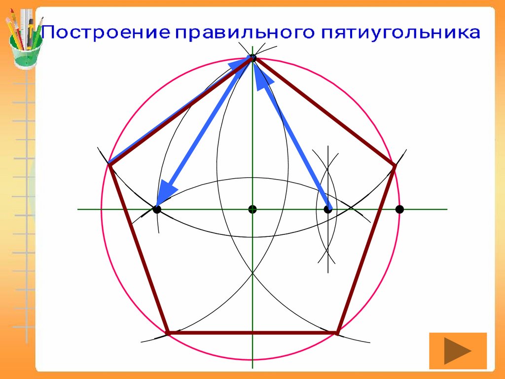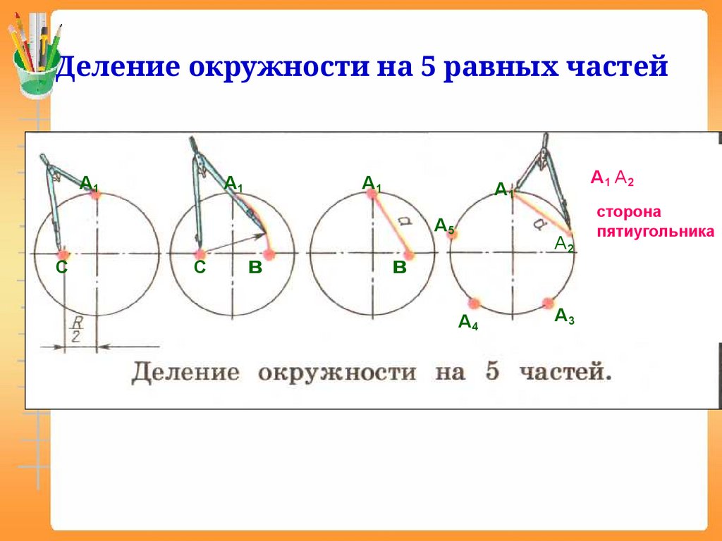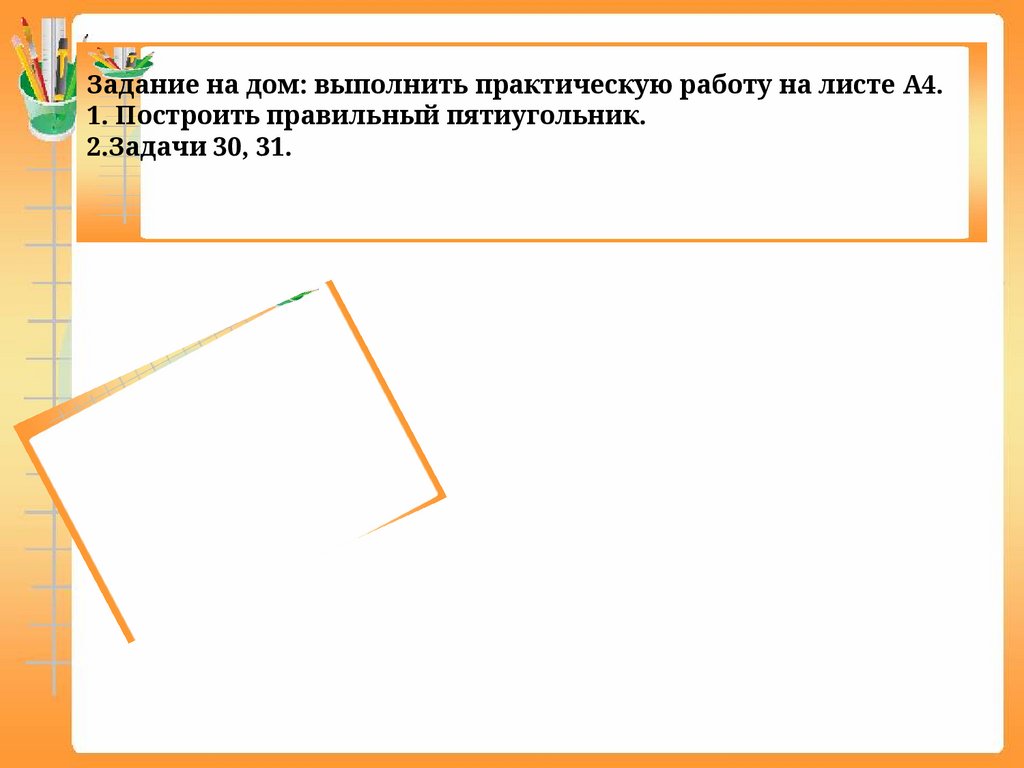 Задание на дом: выполнить практическую работу на листе А4.1. Построить правильный пятиугольник.