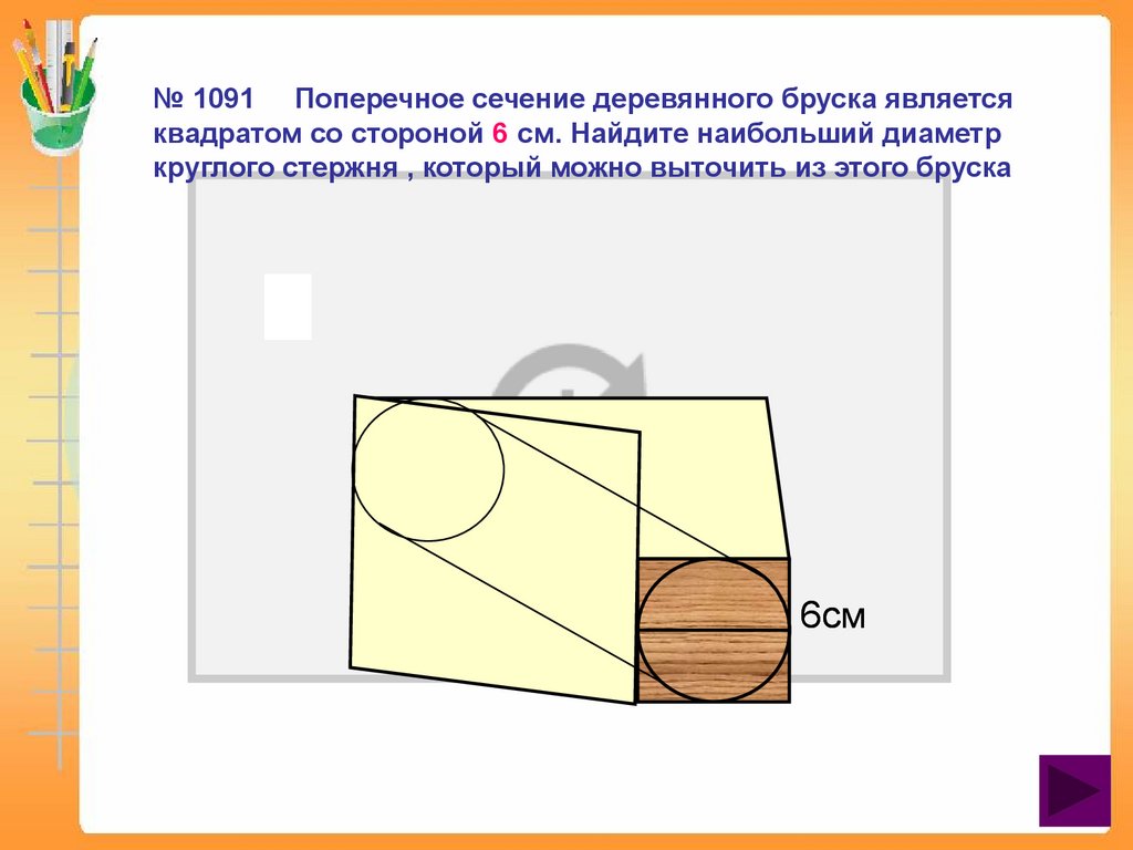 № 1091 Поперечное сечение деревянного бруска являетсяквадратом со стороной 6 см. Найдите наибольший диаметр