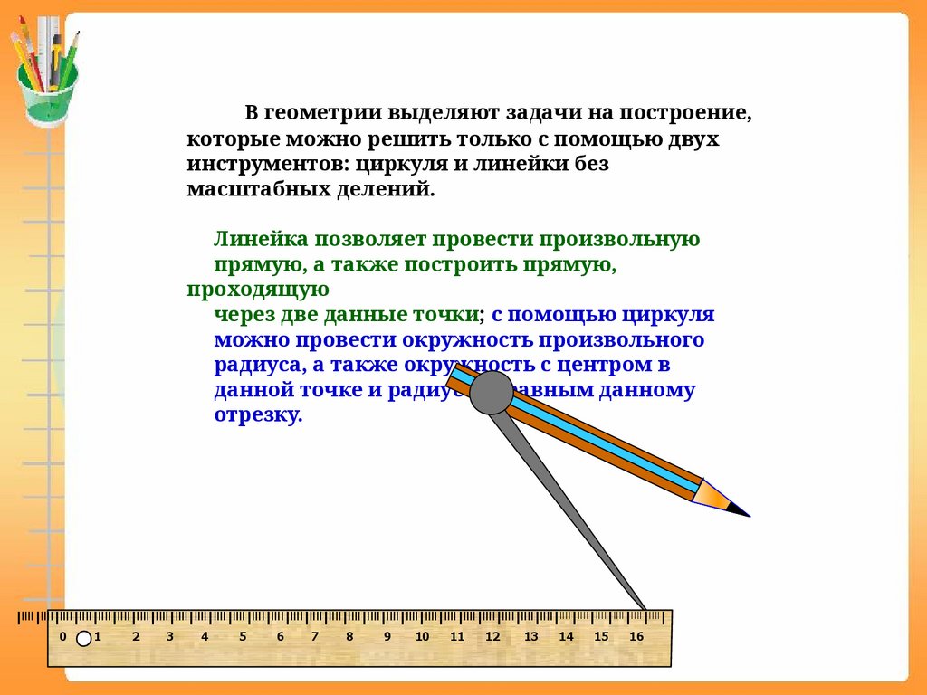 В геометрии выделяют задачи на построение,которые можно решить только с помощью двух
