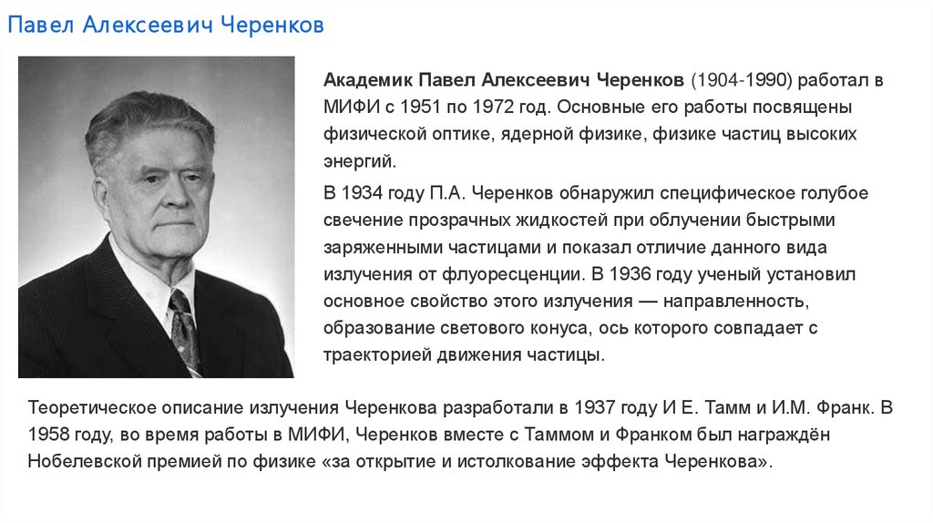 1958 году, во время работы в МИФИ, Черенков вместе с Таммом и Франком был награждён