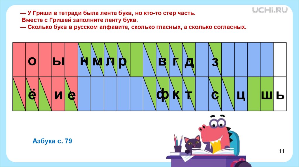 — У Гриши в тетради была лента букв, но кто-то стер часть.Вместе с Гришей заполните ленту букв.