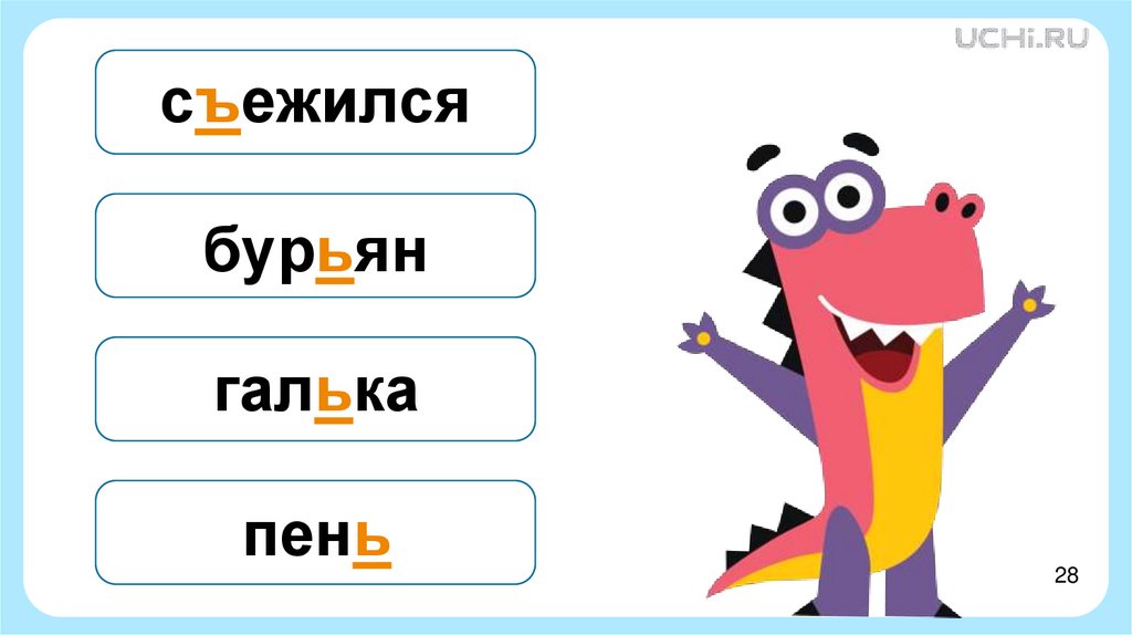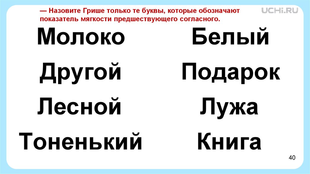 — Назовите Грише только те буквы, которые обозначаютпоказатель мягкости предшествующего согласного.