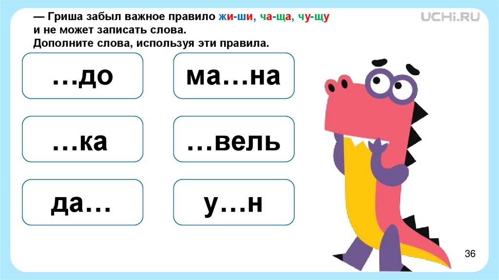 — Гриша забыл важное правило жи-ши, ча-ща, чу-щуи не может записать слова.
