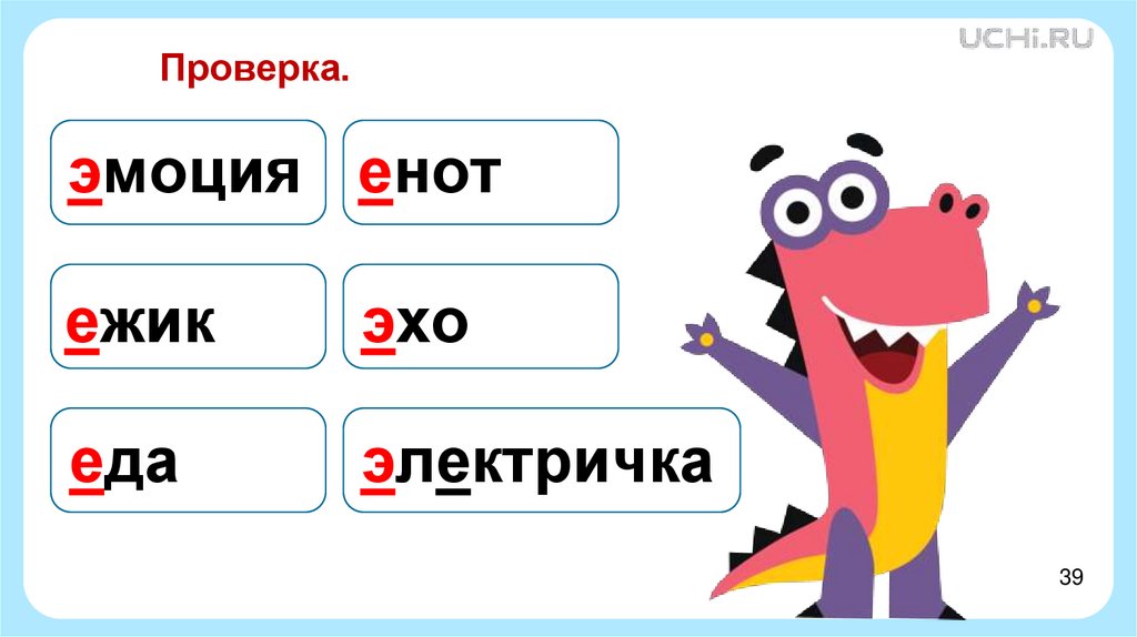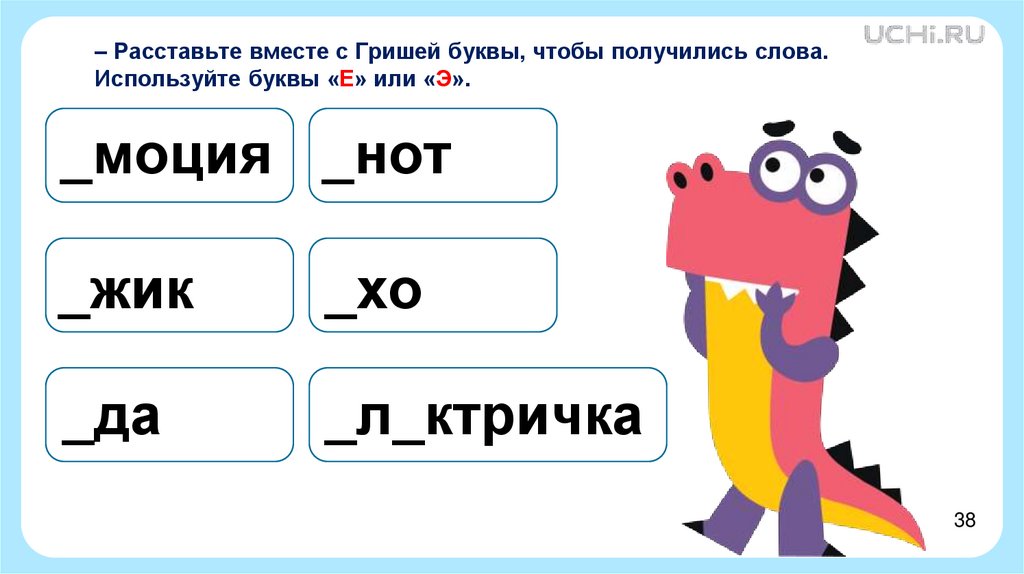 – Расставьте вместе с Гришей буквы, чтобы получились слова.Используйте буквы «Е» или «Э».