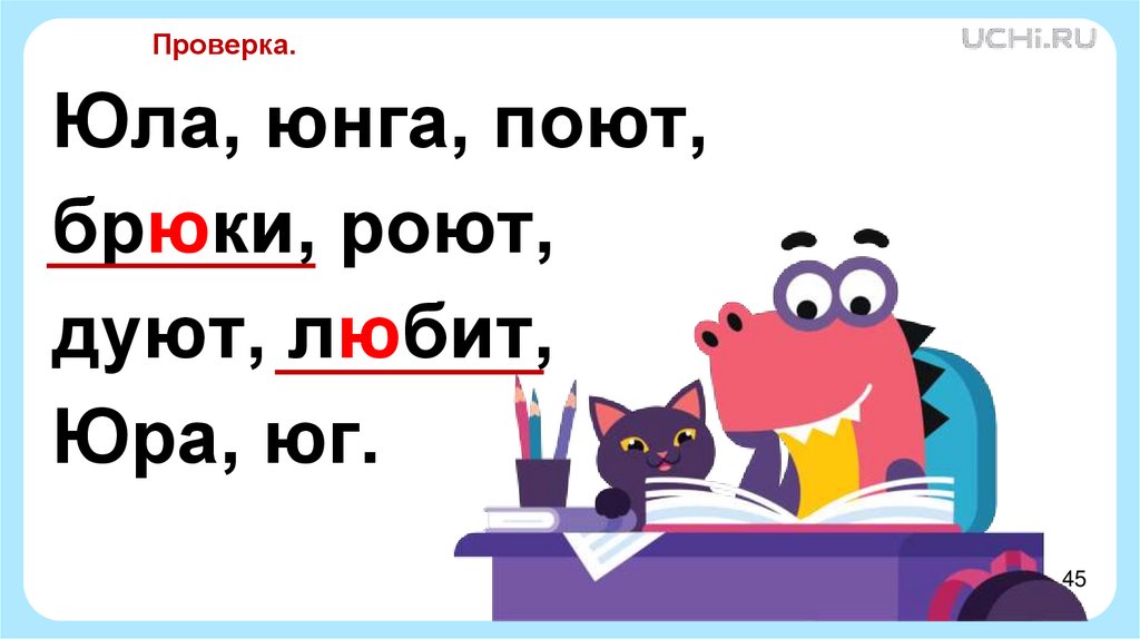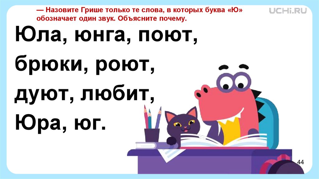 — Назовите Грише только те слова, в которых буква «Ю»обозначает один звук. Объясните почему.