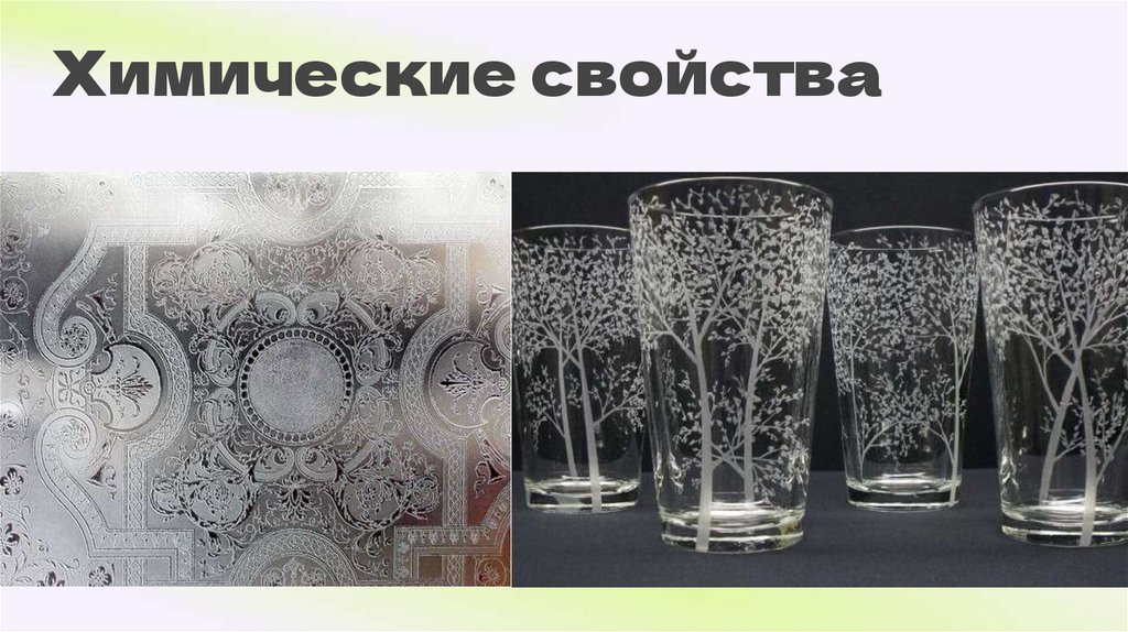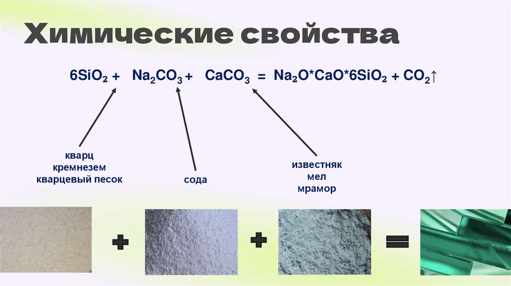 Химические свойства6SiO₂ + Na2CO3 + CaCO3 = Na₂O*CaO*6SiO₂ + CO2↑