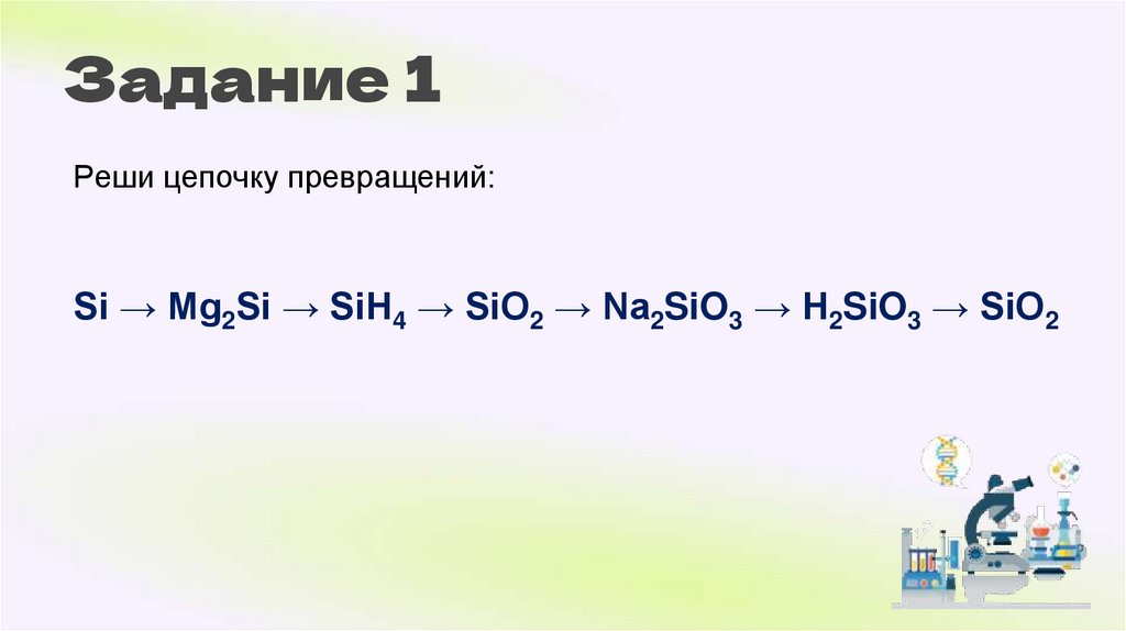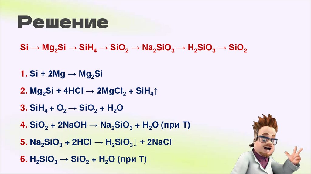 РешениеSi → Mg2Si → SiH4 → SiO2 → Na2SiO3 → H2SiO3 → SiO2