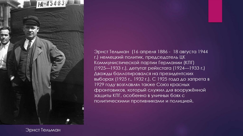 Эрнст Тельман (16 апреля 1886 - 18 августа 1944г.) немецкий политик, председатель ЦК