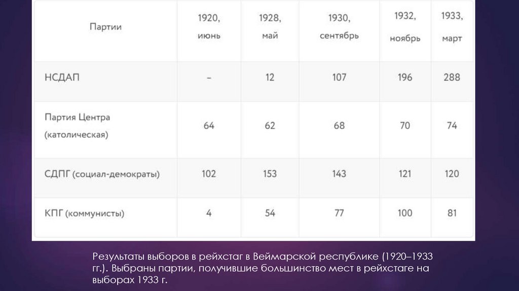 Результаты выборов в рейхстаг в Веймарской республике (1920–1933гг.). Выбраны партии, получившие большинство мест в рейхстаге на